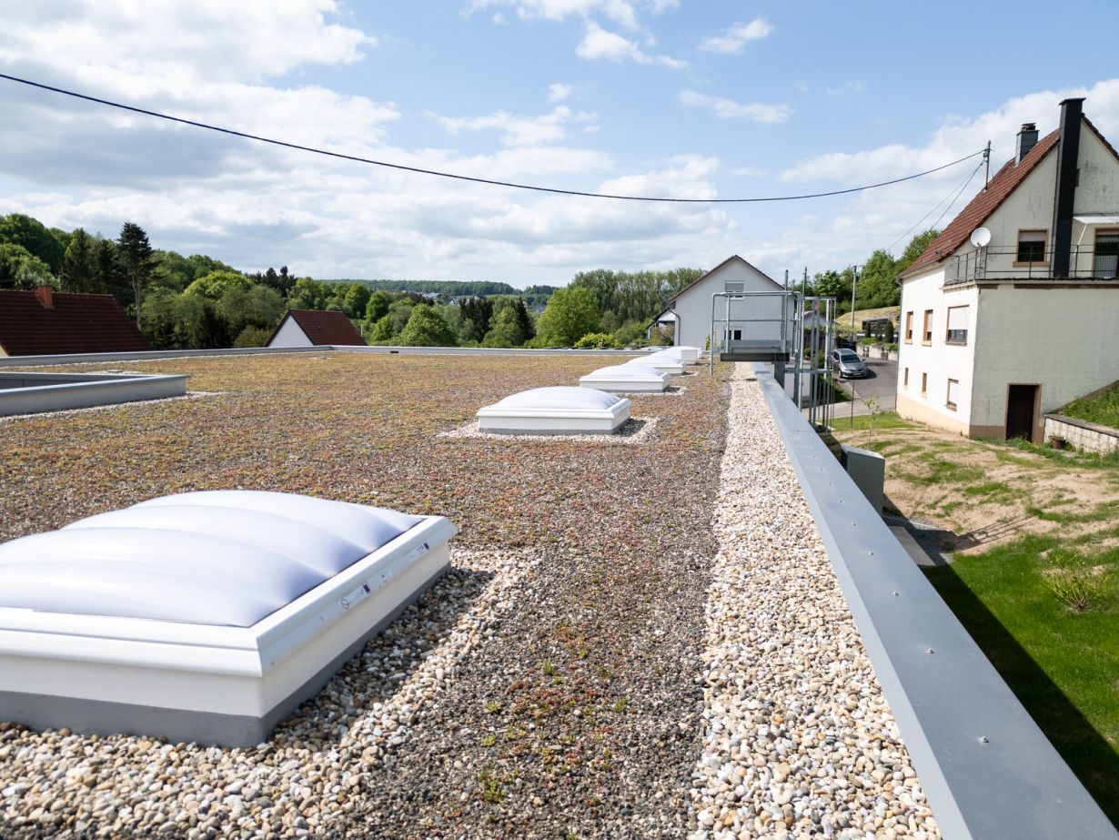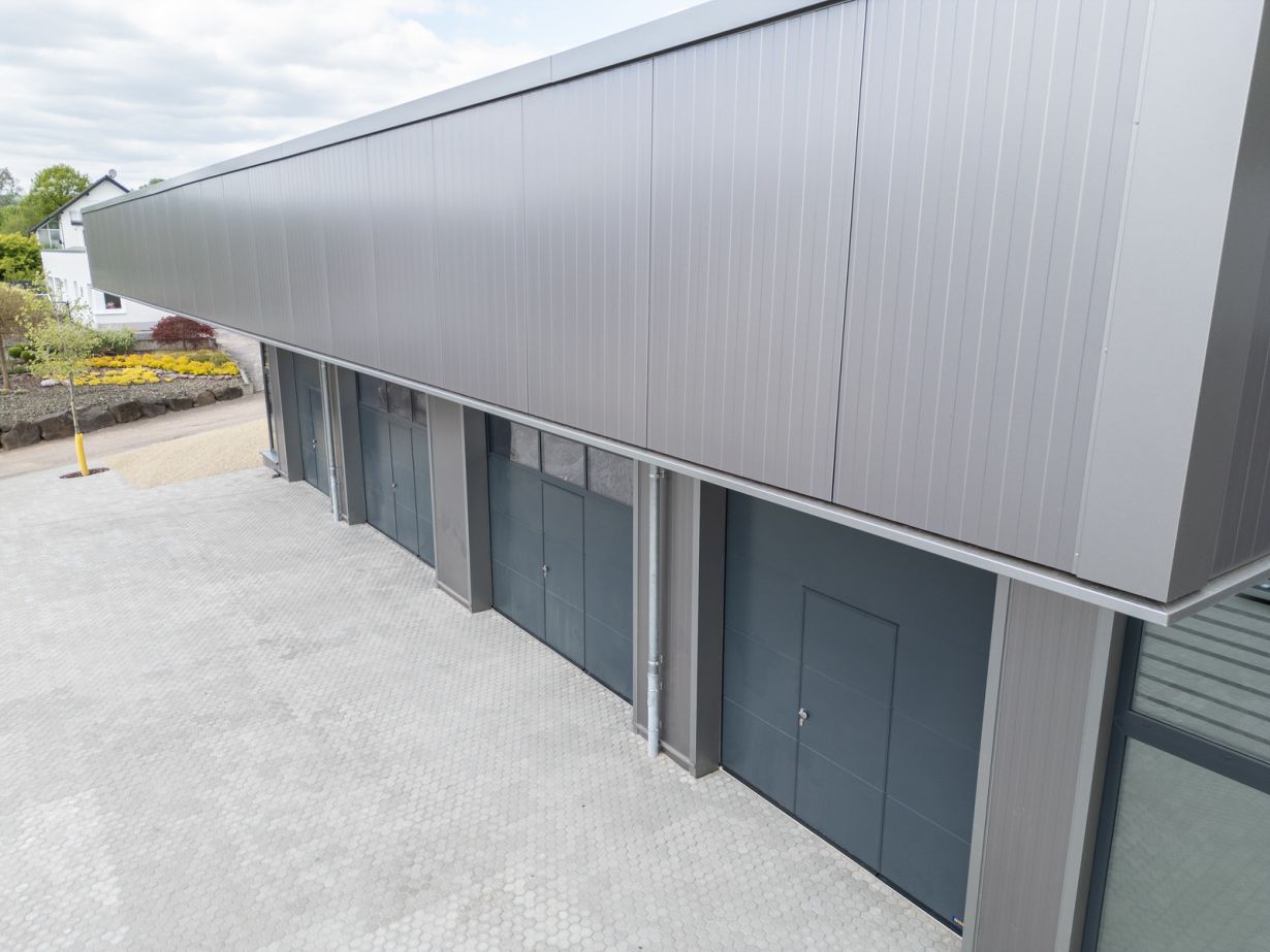 Montage funktionaler Verkleidungselemente für einen witterungsbeständigen und robusten Gebäudeabschluss. Flachdachaufbau inkl. Dachbegrünung sowie die Ausführung der Wandverkleidung mit Thermopaneelen gemäß den aktuell technischen Standards und Anforderungen nach GEG.